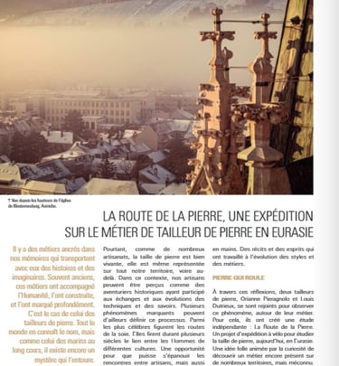 Que ce soit chaque mois ou dans plusieurs numéros, nous avons créé des relations presse dans divers domaines. Nous pouvons ainsi communiquer et faire découvrir le métier de tailleur de pierre en Eurasie à travers différents centre d'intérêts et points de vue. Que ce soit dans des magazines professionnels, sportifs, cultures ou de voyages, il nous tient à coeur de pouvoir partager notre expédition et ses résultats à différents publics. En collaborant avec un large éventail de journaux et magazines, c'est aussi sensibiliser les personnes au métier de tailleur de pierre, à ses richesses et son activité actuelle, bien vivante !