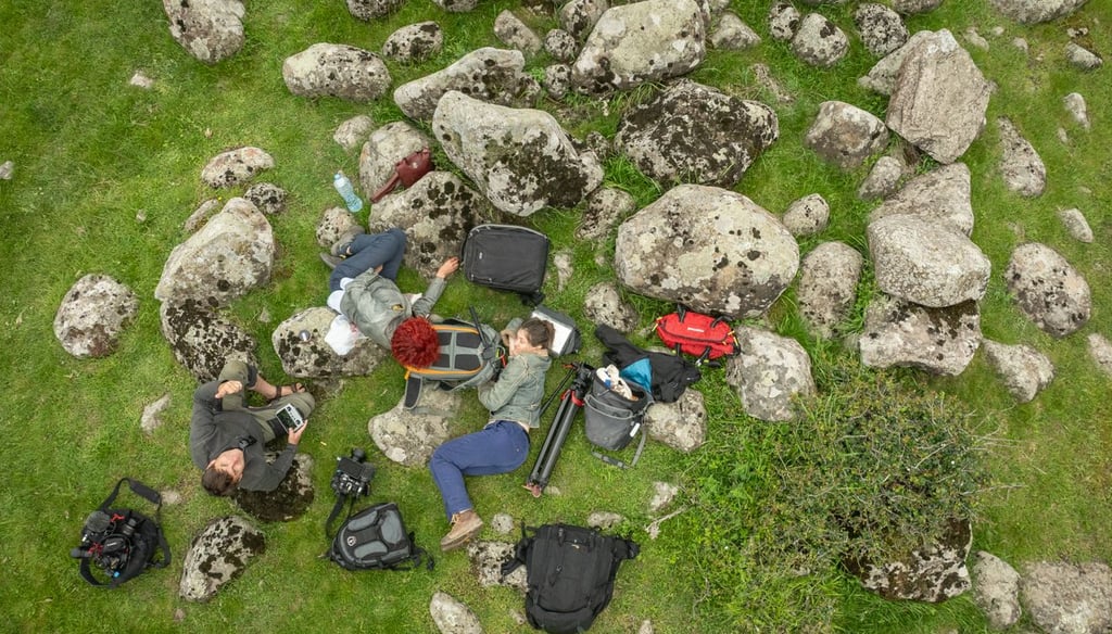 Rapidement, Orianne et moi avons dû apprendre à mêler nos savoir-faire à ceux de l’équipe de tournage, à construire ensemble une autre forme de chantier : celui du film. Le scénario tenait lieu de plan d’ouvrage, et les réalisateurs, Ombeline et Nicos, en assumaient le rôle de maîtres d’œuvre. Florian, le cadreur, forgeait les images à l’aide de ses caméras et de ses drones. Irma, notre fixeuse, et Gia, son assistant, veillaient à la logistique et à la traduction, nourrissant chaque journée d’histoires du pays, tels de véritables ingénieurs de terrain. Et nous, tailleurs de pierre sur nos vélos, apportions notre regard, en dialogue avec celui des spécialistes rencontrés tout au long du voyage, pour relier le public à ce que la pierre tisse depuis toujours : des liens entre les Hommes.